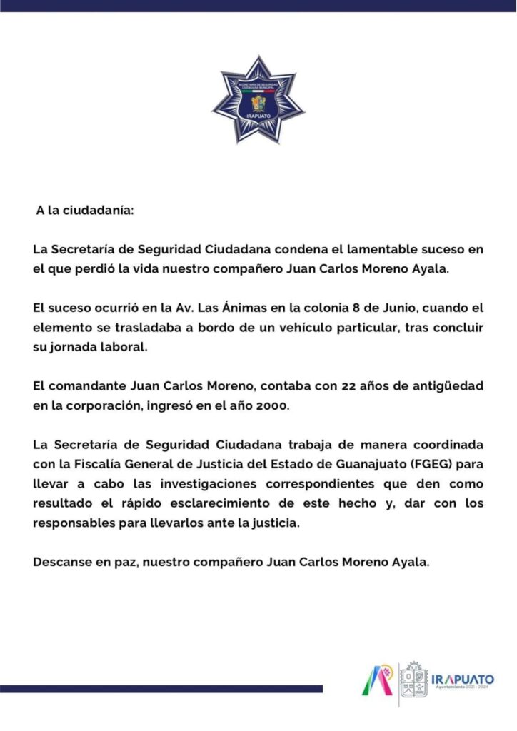 La tarde de este martes, empistolados ultimaron a balazos a Juan Carlos Moreno Ayala, quien era comandante de la Secretaría de Seguridad Ciudadana del municipio Irapuato, cuando este salía de su turno laboral.