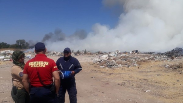 Personal de la Dirección de Protección Civil y Bomberos del municipio de Celaya trabajan para sofocar el incendio del basurero municipal de Comonfort.