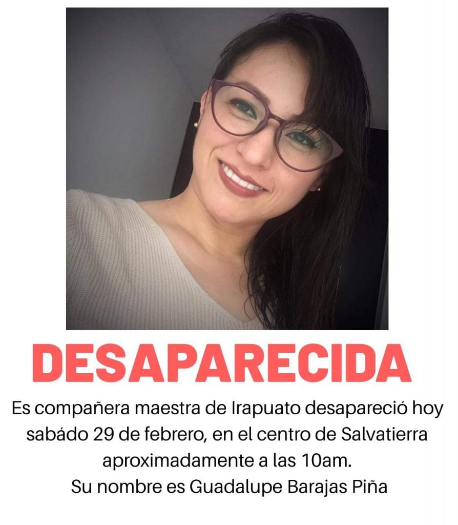 La Fiscalía General del Estado recibió una denuncia por la desaparición de María Guadalupe de 30 años, de profesión profesora y quien laboraba en la Escuela Primaria 'Guadalupe Victoria', ubicada en la comunidad Valencianita en Irapuato, Guanajuato.