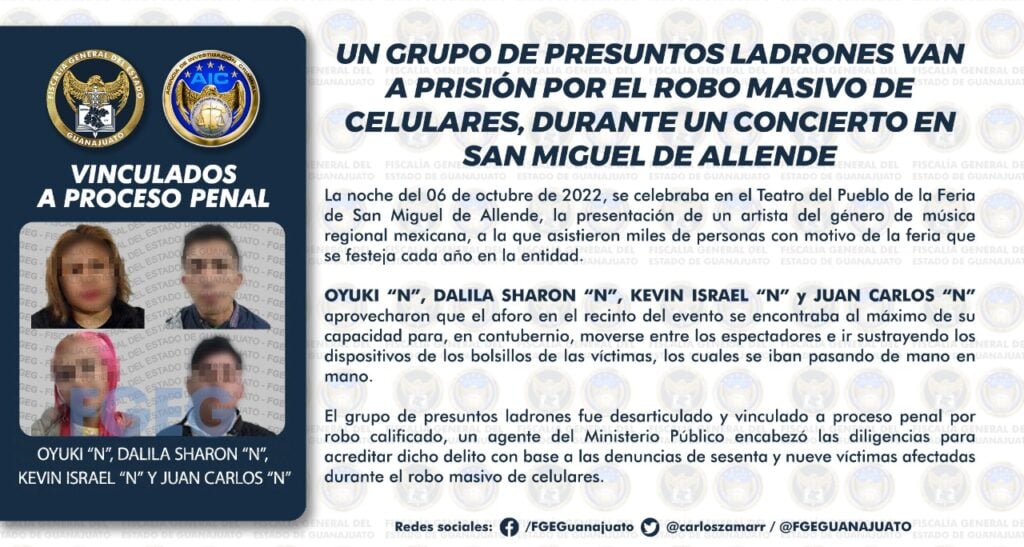 Cuatro personas fueron detenidas y vinculadas a proceso penal acusados de robar 69 celulares durante un concierto en el municipio de San Miguel de Allende.