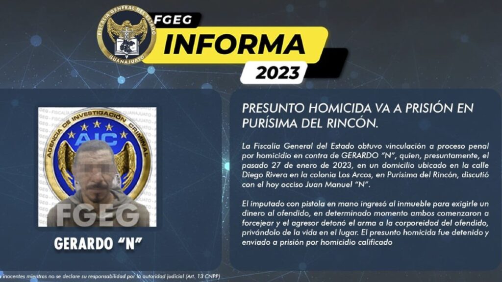 La Fiscalía General del Estado obtuvo vinculación a proceso penal por homicidio en contra de Gerardo quien presuntamente el 27 de enero de 2023, en un domicilio ubicado en la calle Diego Rivera en la colonia Los Arcos, en Purísima del Rincón, discutió con la víctima de nombre Juan Manuel.