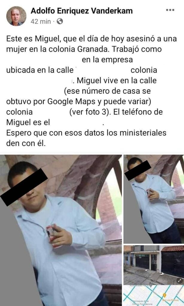 A través de sus redes sociales, el activista Adolfo Enríquez Vanderkam compartió información del presunto atacante, incluida la localización de su domicilio, anterior trabajo, nombre e incluso número telefónico, junto con una fotografía donde se ve su rostro.