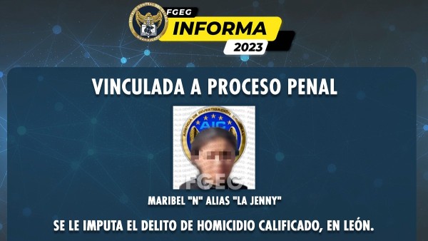 Por lo anterior, la Fiscalía General del Estado obtuvo una orden de aprehensión para la captura de “La Jenny”, quien fue llevada a audiencia, donde el Ministerio Público logró que fuera vinculada a proceso penal por homicidio calificado en agravio de Oscar Alejandro “N” y José Guadalupe “N”.
