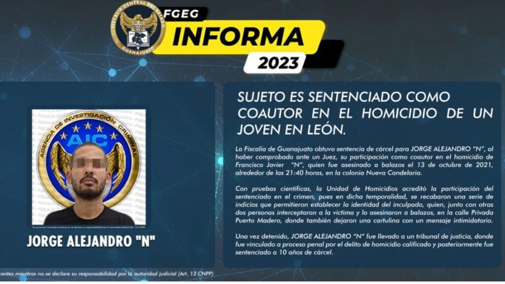 La Fiscalía de Guanajuato obtuvo sentencia de cárcel para Jorge Alejandro, al haber comprobado ante un juez, su participación como coautor en el homicidio de Francisco Javier, quien fue asesinado a balazos el 13 de octubre de 2021, alrededor de las 21:40 horas, en la colonia Nueva Candelaria.