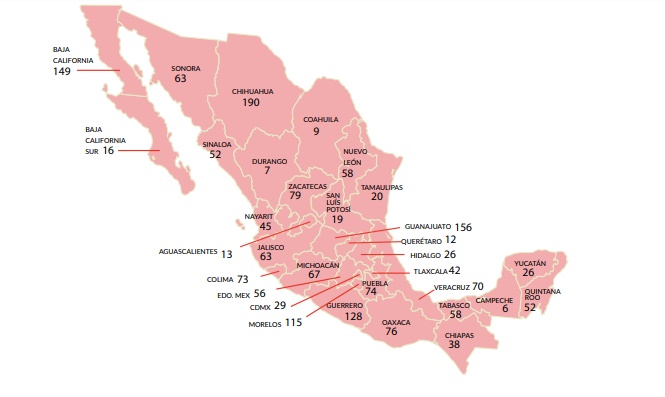Los estados donde se registraron más noticias de atrocidades fueron Chihuahua, con al menos 190; seguido por Guanajuato, con 156; Baja California, con 149; Guerrero, con 128 y Morelos, con al menos 115.