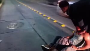Policía y el sujeto fue detenido; previo la detención, un buen ‘samaritano’, lo mantiene en el piso para que no huya.