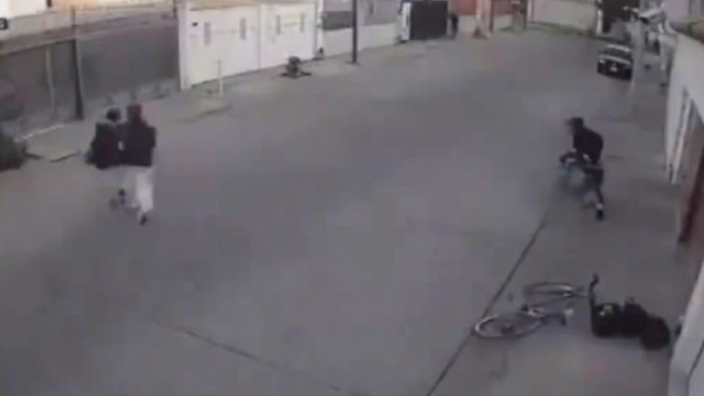Una cámara de videovigilancia captó el momento justo en el que dos hombres que iban en sus bicicletas se van contra el joven que caminaba por la banqueta en sentido contrario.