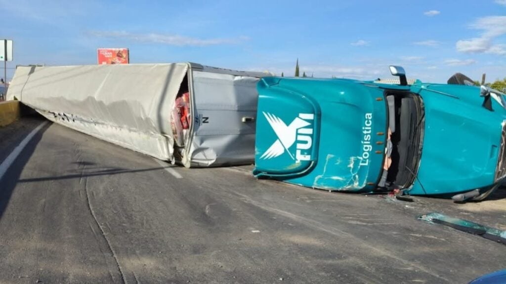 Silao, Guanajuato - Un accidente de tránsito ocurrió en la carretera federal 45, a la altura de la curva conocida como 'El Potrero', la volcadura de un tráiler cerró los tres carriles en dirección al municipio de Silao.