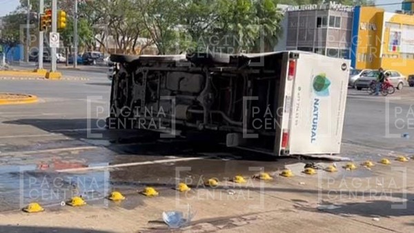 Debido al fuerte impacto, la camioneta se volcó sobre su costado y los garrafones se salieron y se tronaron, dejando toda la vía mojada.
