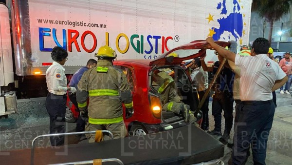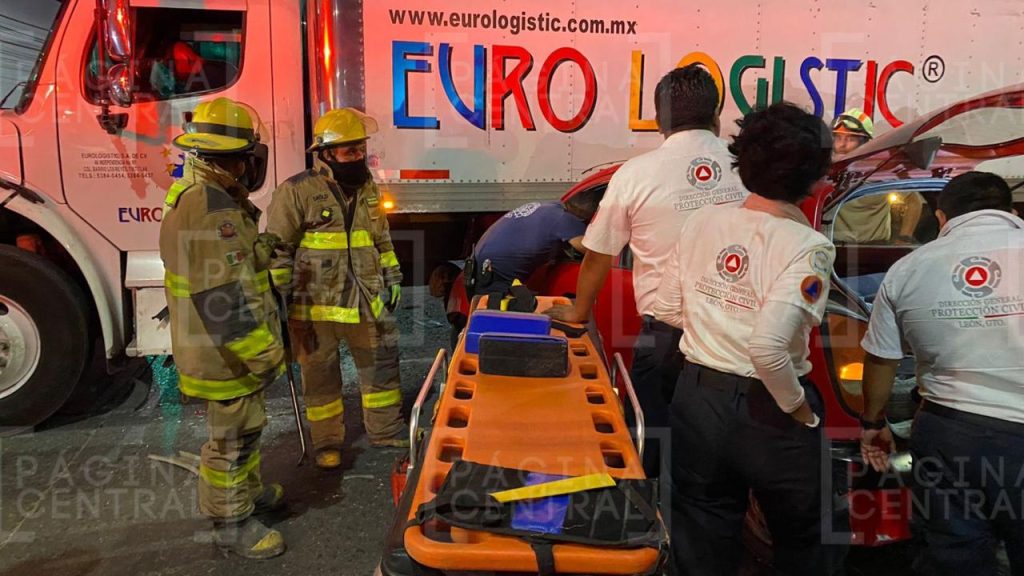 León, Guanajuato - Un fuerte accidente se registró la noche del martes entre un vehículo particular y un camión de carga en la colonia Industrial Delta.