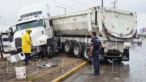 León, Guanajuato - Un camión de carga perdió el control, subió al camellón del Libramiento Morelos y chocó con la ciclovía, accidente que presumiblemente derivó del asfalto mojado por la llovizna que cae esta mañana en León.