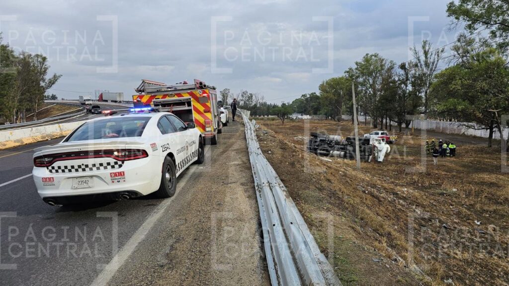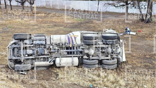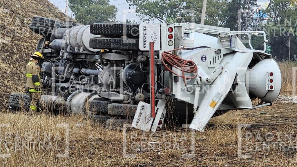 León, Guanajuato - El conductor de una máquina revolvedora sufrió un fuerte accidente que provocó la volcadura de la unidad en la Maxipista León-Aguascalientes.