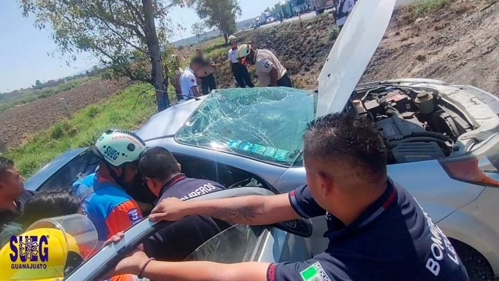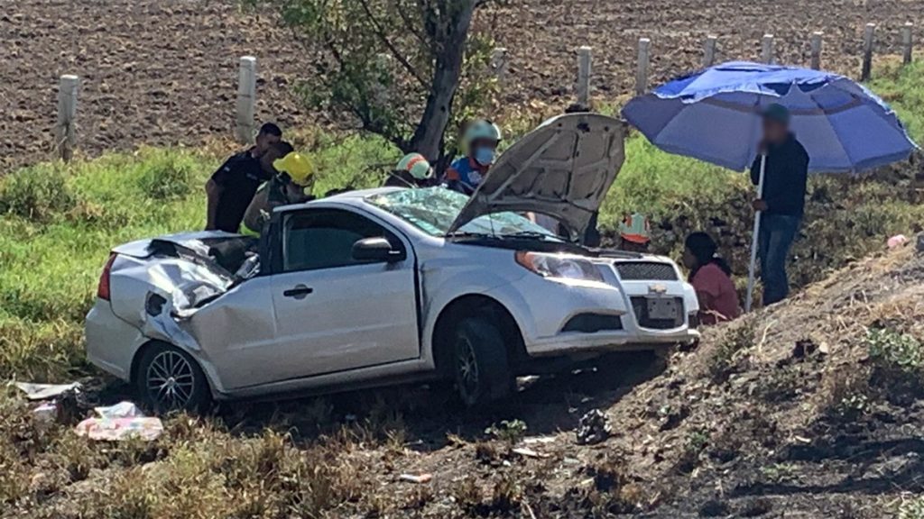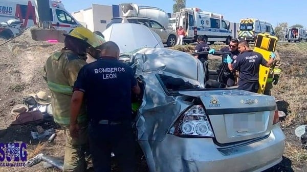 León - Cuatro personas resultaron heridas, entre ellas un menor de edad, tras un aparatoso accidente de tránsito registrado la tarde de este miércoles en la carretera León-Aguascalientes, a la altura del kilómetro 14.
