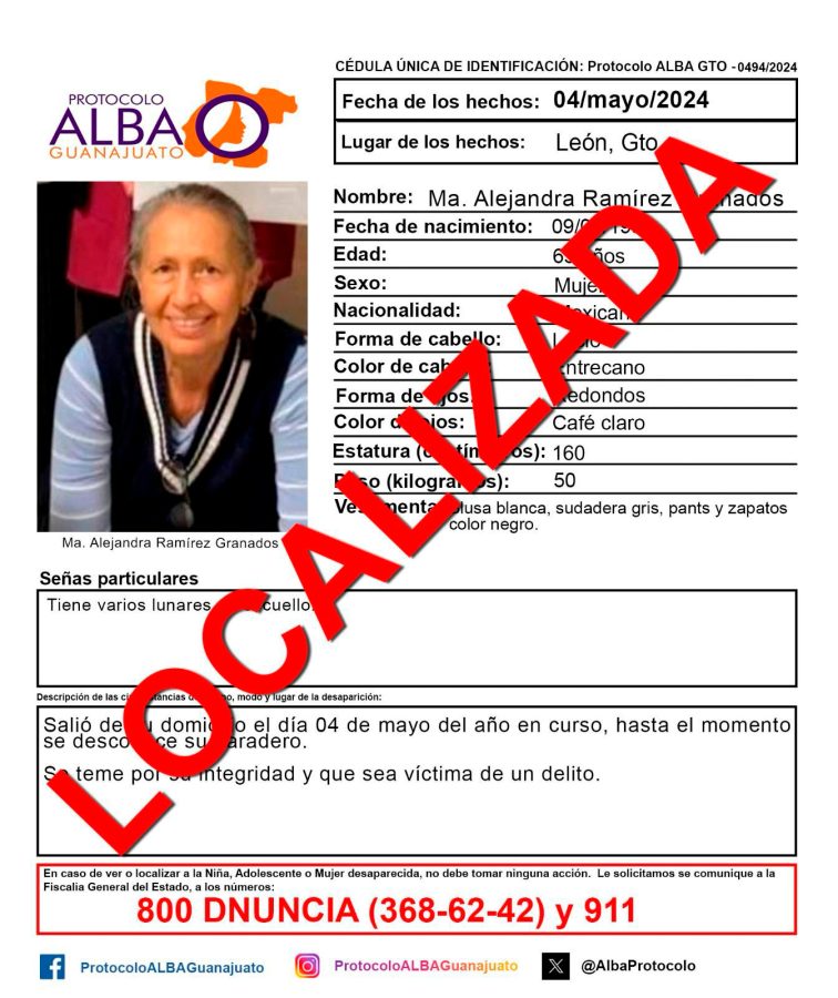León - La Fiscalía de Guanajuato informó sobre la localización de Ma. Alejandra Ramírez Granados, quien había sido reportada como desaparecida en León.