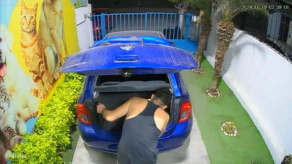 En el video, se observa cómo el individuo actúa con rapidez pero, al ver que pasa un automóvil frente a la veterinaria, se regresa para intentar esconderse detrás del vehículo. Al notar que el auto sigue su camino, abre la reja, la cierra y se retira con los objetos robados.