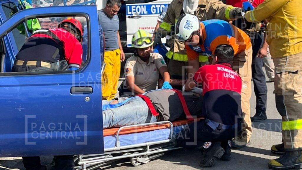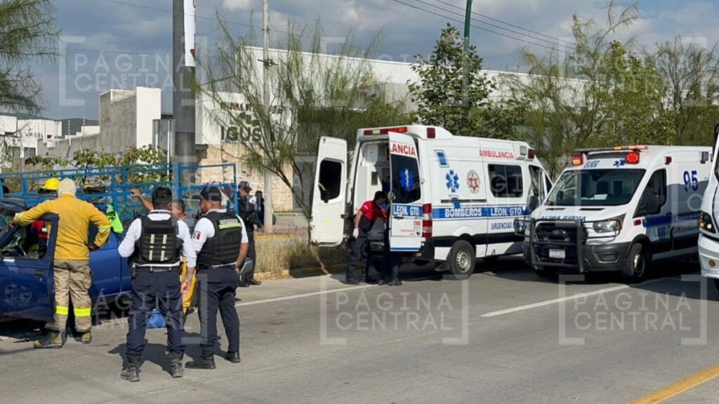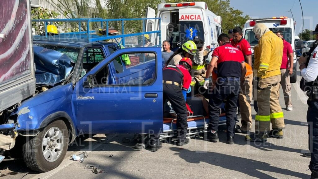 León, Guanajuato - El conductor de una camioneta Nissan Frontier 'se clavó' en la parte trasera de un camión de traslado de carnes que estaba detenido por la ponchadura de una llanta en el Eje Metropolitano.