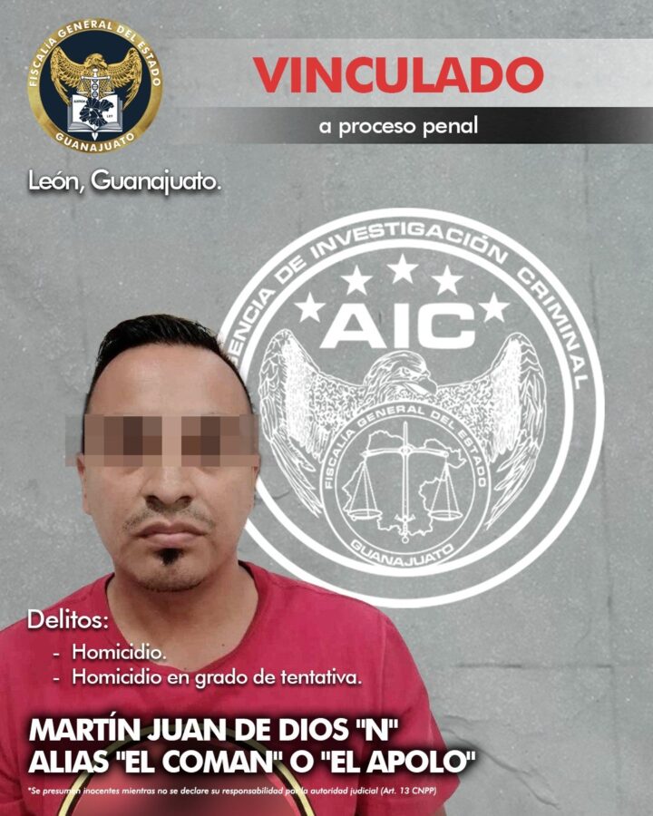 León, Guanajuato - Agentes de Investigación Criminal capturaron a un hombre identificado como Martín Juan de Dios, también conocido como “El Coman” o “El Apolo”, mismo que quedó vinculado a proceso por su presunta responsabilidad en el asesinato de un hombre y así como lesiones a dos personas en la colonia Ibarrilla en León.