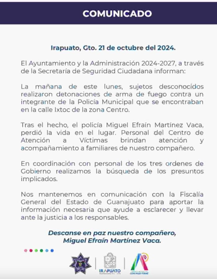 Al menos 7 disparos dicen recordar trabajadores de la zona. Miguel, estaba llegando a la comandancia de la calle Ixtoc de la zona centro de Irapuato para cerrar su turno cuando sujetos le acribillaron ante los ojos de su compañera.