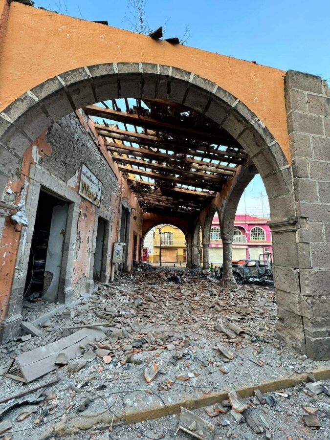 La explosión de la patrulla en Jerécuaro provocó daños importantes en varios inmuebles de la zona. Fotos: Especiales