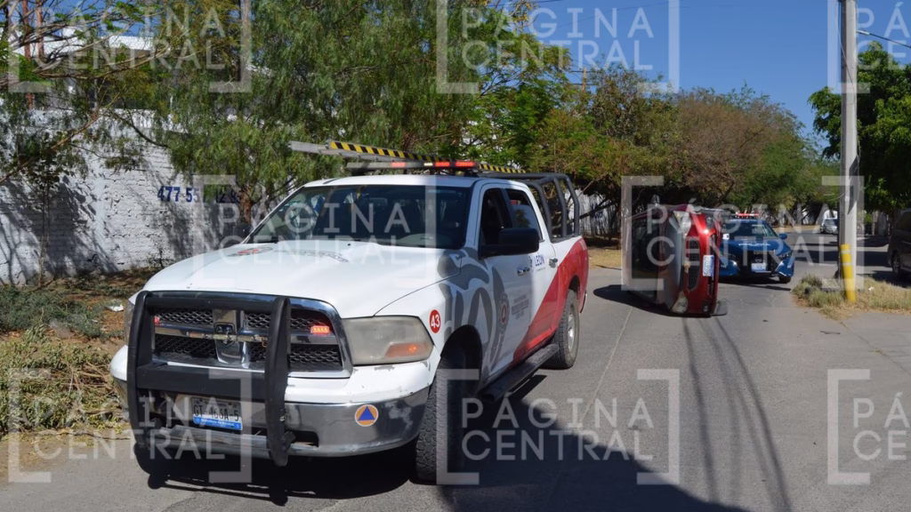 León, Guanajuato - Una fuerte volcadura en Agua Azul se registró la tarde de este jueves en la tercera sección, cuando un Chevrolet Aveo rojo impactó contra un poste de la Comisión Federal de Electricidad (CFE) y terminó volcado.