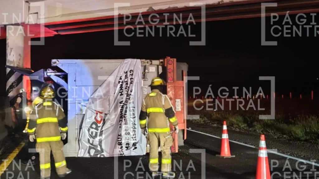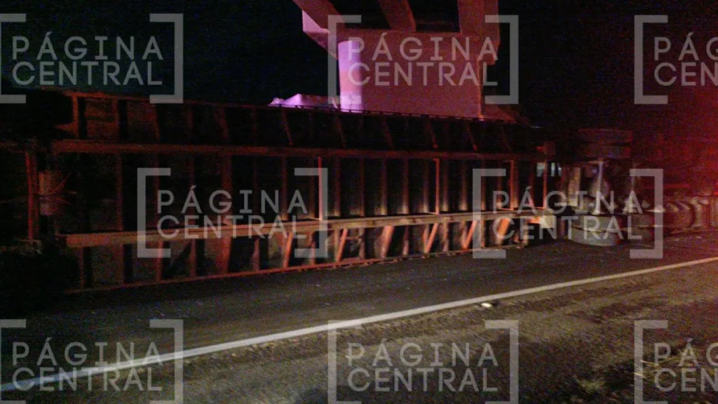 De acuerdo con los primeros informes, el accidente ocurrió cuando el conductor del tráiler no calculó la altura de la carga que transportaba y, al impactarse contra un puente vehicular, provocó que el tráiler se volcara sobre su costado derecho, quedando atravesado en la carpeta asfáltica.