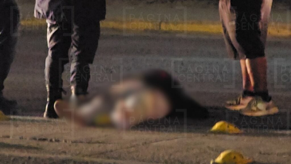 Casco destrozado y sangre en el pavimento