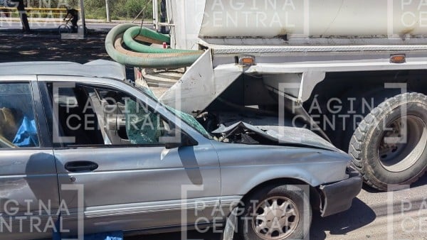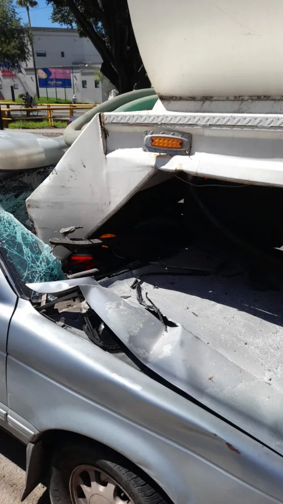 El incidente ocurrió alrededor de las 10:04 de la mañana, cuando un vehículo Nissan Tsuru azul se impactó por alcance contra una pipa blanca.