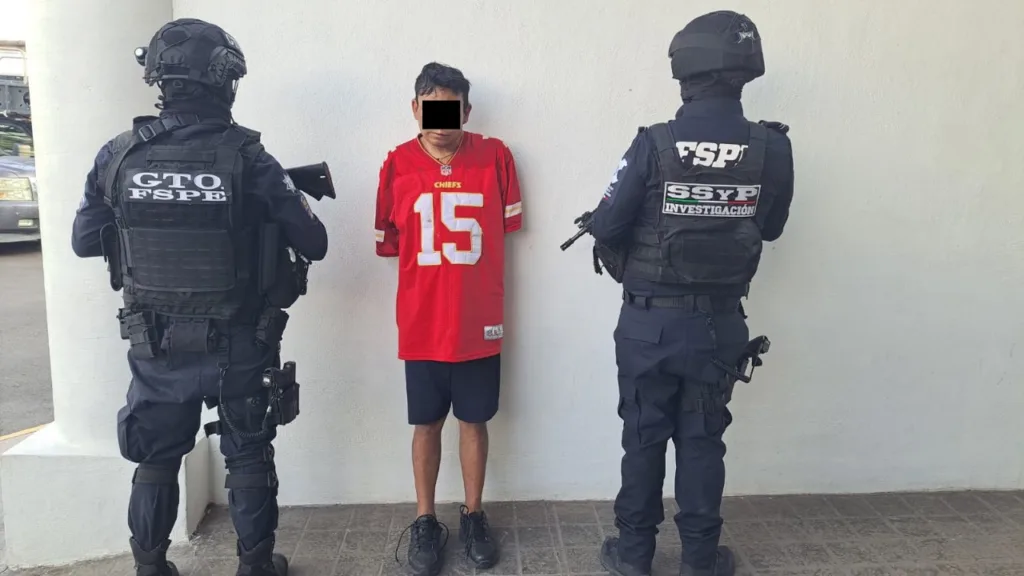 El detenido, de 25 años y originario de Salamanca, se investiga por delitos como homicidio, extorsión y robo con violencia de autotransporte. Junto con él se detuvo a Elizabeth, de 27 años y originaria de Yuriria; Gerardo, de 28 años, originario de Celaya; y una persona más cuya identidad se encuentra en proceso de verificación.