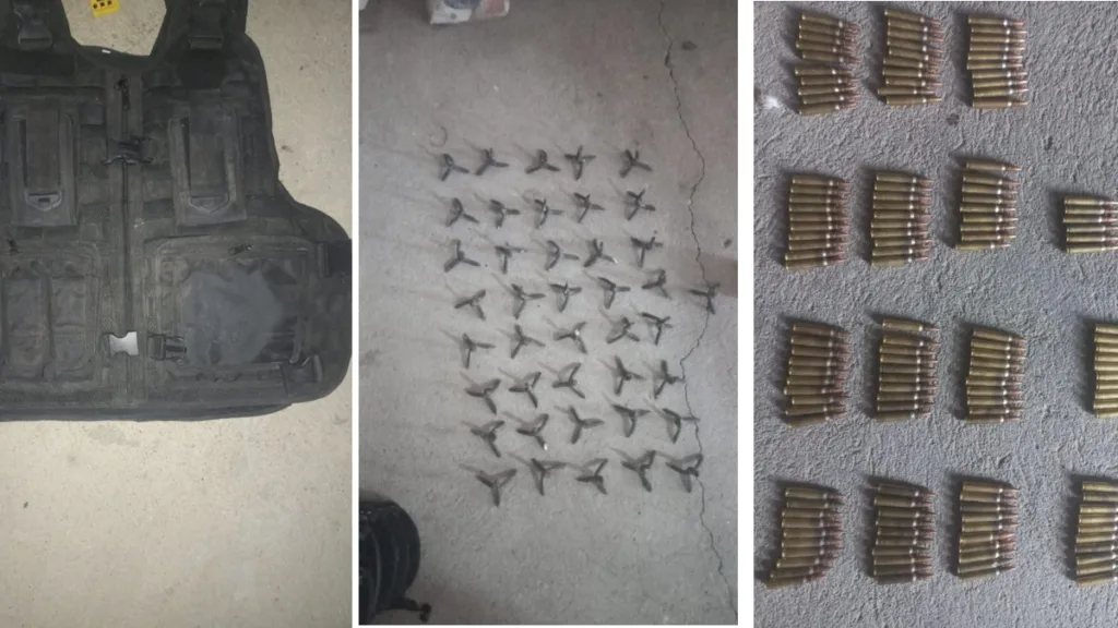 -146 cartuchos útiles, calibre .223 mm -3 casquillos percutidos calibres 9 mm, 7.62x39 mm (STR), y uno sin marca -4 pares de botas tácticas negras -4 chalecos balísticos con placas