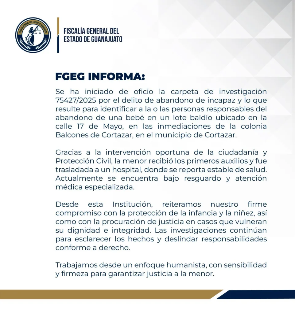 “Gracias a la intervención oportuna de la ciudadanía y Protección Civil, la menor recibió los primeros auxilios y fue trasladada a un hospital, donde se reporta estable de salud. Actualmente, se encuentra bajo resguardo y atención médica especializada”, señala el documento oficial.