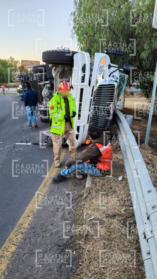 De acuerdo con la primera información, el conductor del tráiler que sufrió la volcadura en Irapuato no resultó con lesiones de gravedad.