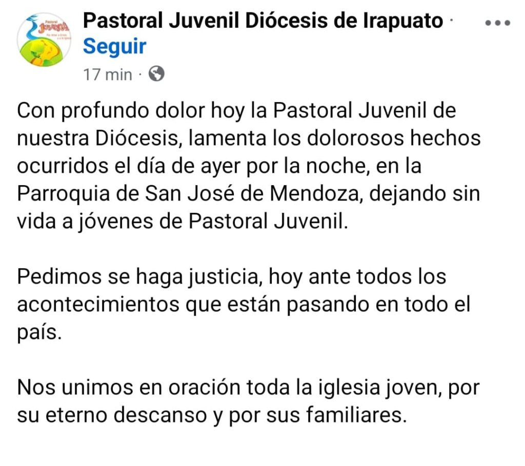 Con profundo dolor, hoy la Pastoral Juvenil de nuestra Diócesis lamenta los dolorosos hechos ocurridos la noche de ayer en la parroquia de San José de Mendoza, dejando sin vida a jóvenes de Pastoral Juvenil", se lee en la última publicación de su página de Facebook.