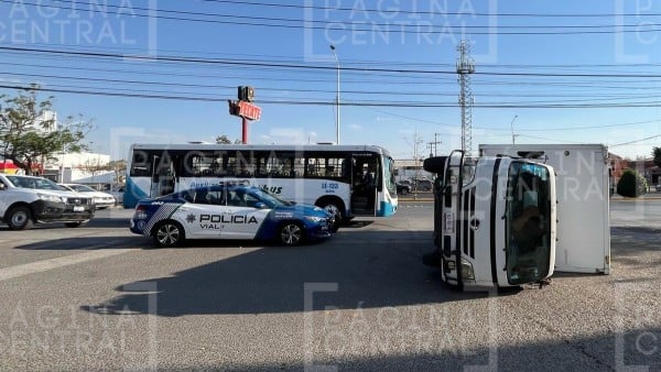 León, Guanajuato - Una camioneta blanca de carga volcó la tarde de este miércoles tras chocar contra un camión urbano de la ruta auxiliar X2, perteneciente a la empresa Garita