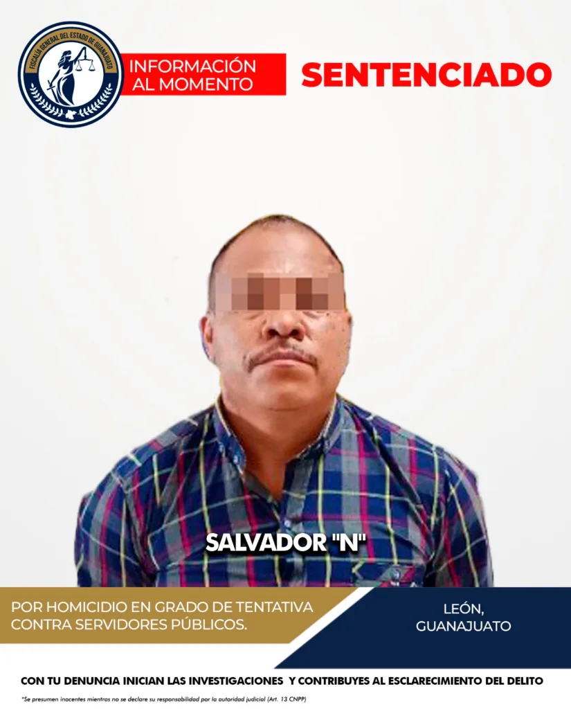 León– La Fiscalía General del Estado de Guanajuato obtuvo una sentencia de 40 años de prisión contra Salvador 'N', quien intentó asesinar a tres agentes de Investigación Criminal en el municipio de León.