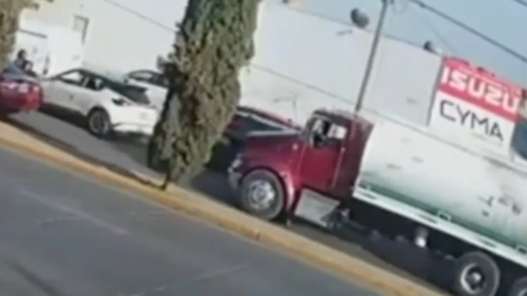 En una cámara de seguridad se observa cómo la pipa bajaba a exceso de velocidad y terminó chocando contra un vehículo de color rojo, proyectándolo contra una camioneta Audi gris.