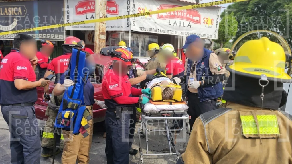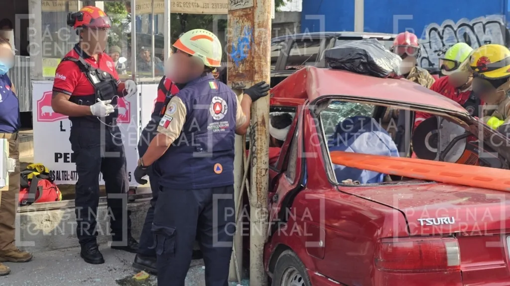 León, Guanajuato - Un aparatoso accidente en el bulevar Delta esquina con la calle Cerro del Gigante, entre un Tsuru y una camioneta de transporte de personal, dejó como saldo dos personas de aproximadamente 50 años muy graves de salud.