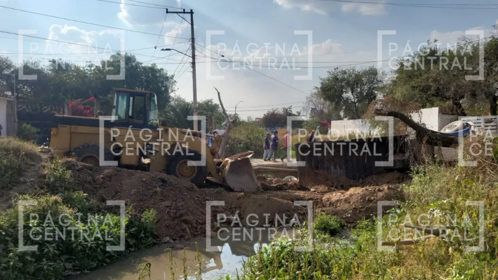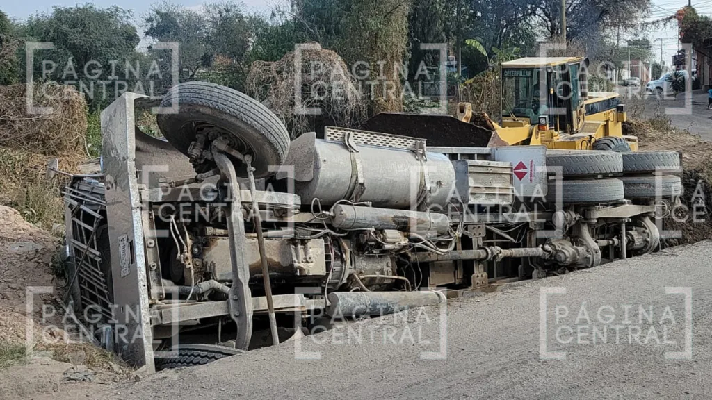 León— Una tolva cargada con material volcara al intentar cruzar un puente angosto que atraviesa un arroyo en la comunidad de Loza de los Padres.
