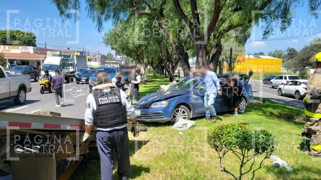 La conductora del Jetta no logró frenar a tiempo y golpeó la llanta trasera de la camioneta, perdió el control del auto y se fue contra un árbol, lo que causó la volcadura en pleno camellón del bulevar Aeropuerto.