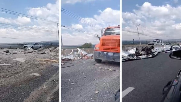 León, Guanajuato - Un fuerte accidente en la carretera León–Lagos se registró la tarde de este lunes, pasando la conocida 'curva del Pato', con dirección a Jalisco, luego de que la carga de un tráiler se soltara y causara severos destrozos.