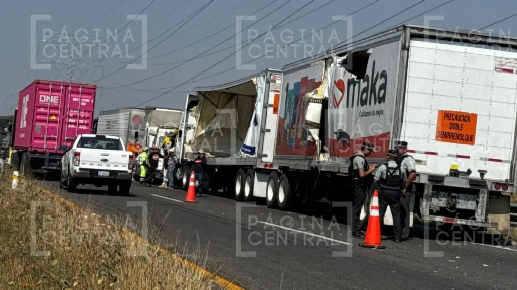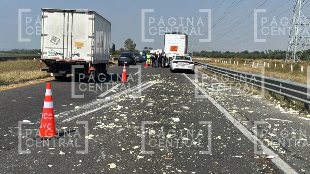 León, Guanajuato - La mañana de este viernes se registró un fuerte accidente sobre la autopista León–Aguascalientes, a la altura de la comunidad San Juan de Abajo, donde un tráiler de doble remolque impactó contra una camioneta perteneciente a una empresa distribuidora de carne.