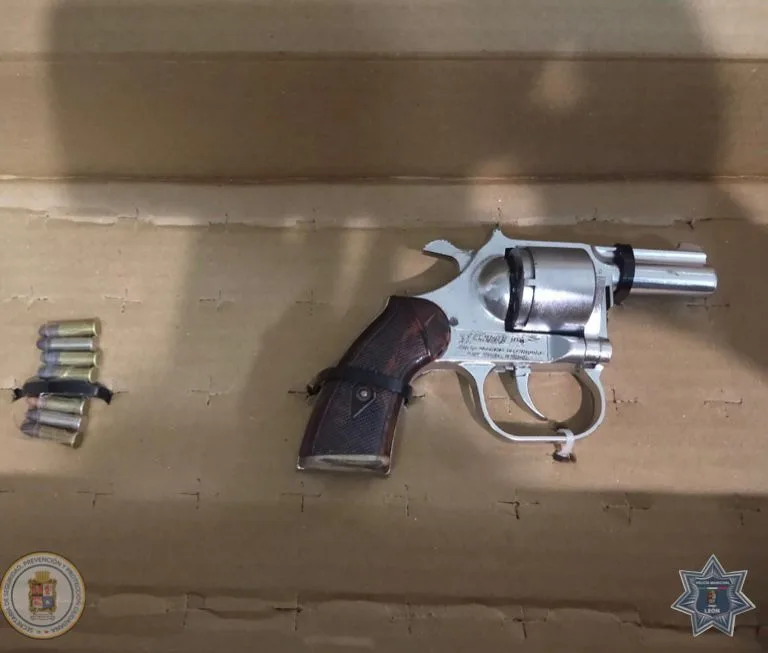 Conforme a los protocolos de seguridad, se le realizó una inspección, encontrándole un arma de fuego corta calibre .22 mm, un cargador y ocho cartuchos útiles.