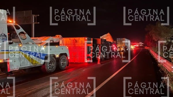 León, Guanajuato - La noche de este jueves se registró una fuerte volcadura de un tráiler de paquetería sobre la autopista León-Aguascalientes, luego de un intento fallido de asalto.