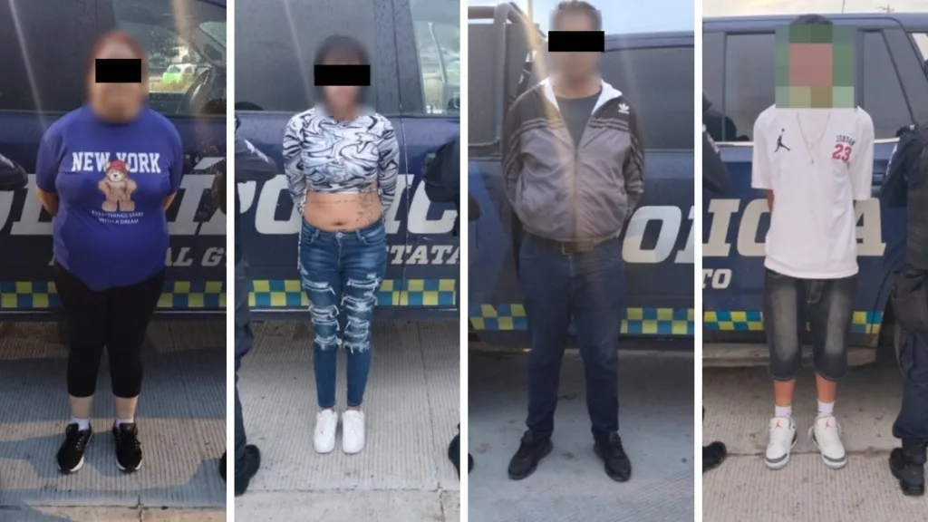 Las personas detenidas se identificaron como Diego (19 años), Antonia (42 años), Florjared (20 años) y Jorge (36 años), con domicilio en las colonias Joyas de Castilla y Parque La Noria, en León.