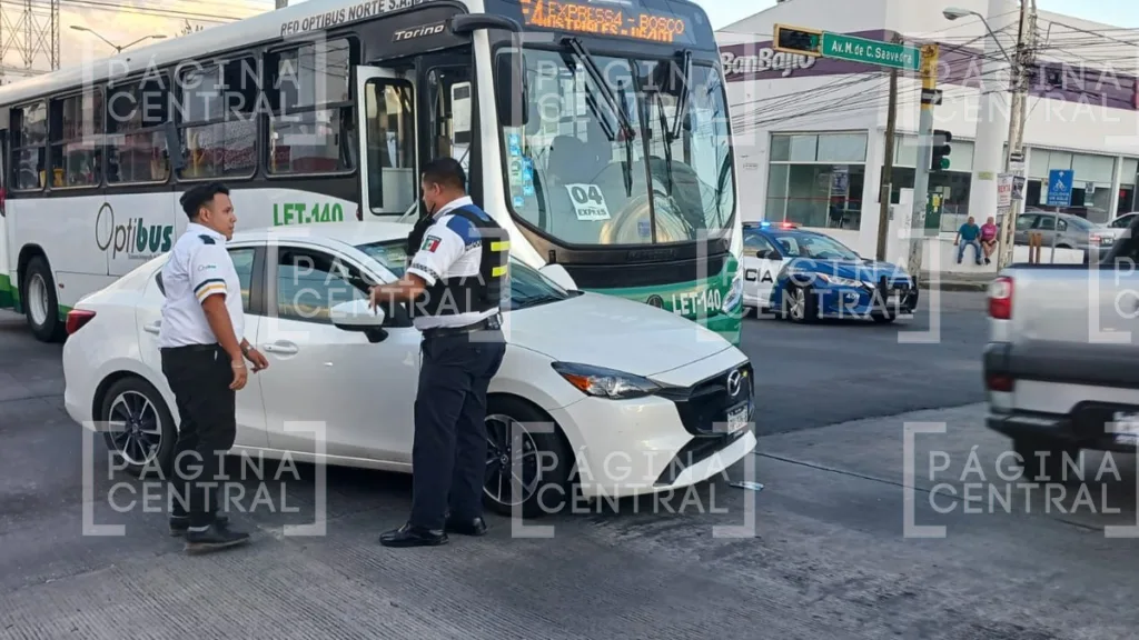León, Guanajuato - Choque entre una ruta express y un auto en la colonia Vista Hermosa en León, dejó como saldo daños materiales y caos vehicular en la zona.