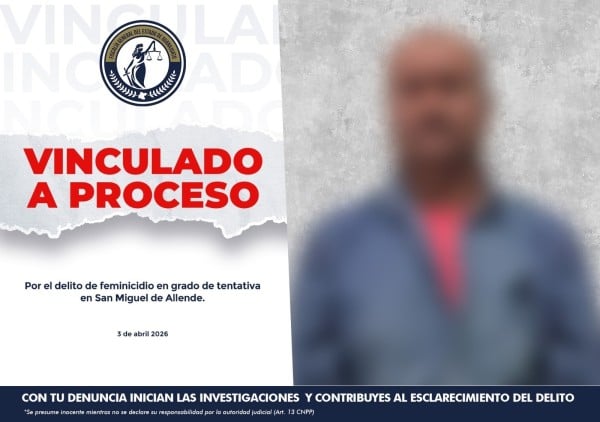 San Miguel de Allende, Guanajuato – La Fiscalía General del Estado de Guanajuato acreditó ante un Juez de Control la probable responsabilidad de Juan “N” por el delito de feminicidio en grado de tentativa, tras un violento episodio registrado en este municipio.