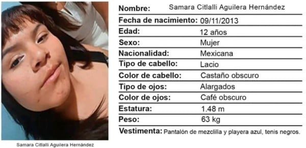 "La adolescente Samara Citlalli Aguilera Hernández fue vista por última vez el día 05 de abril del presente año, sin que hasta el momento se conozca su paradero. Se teme por su integridad dada su minoría de edad y que pueda ser víctima de algún delito".