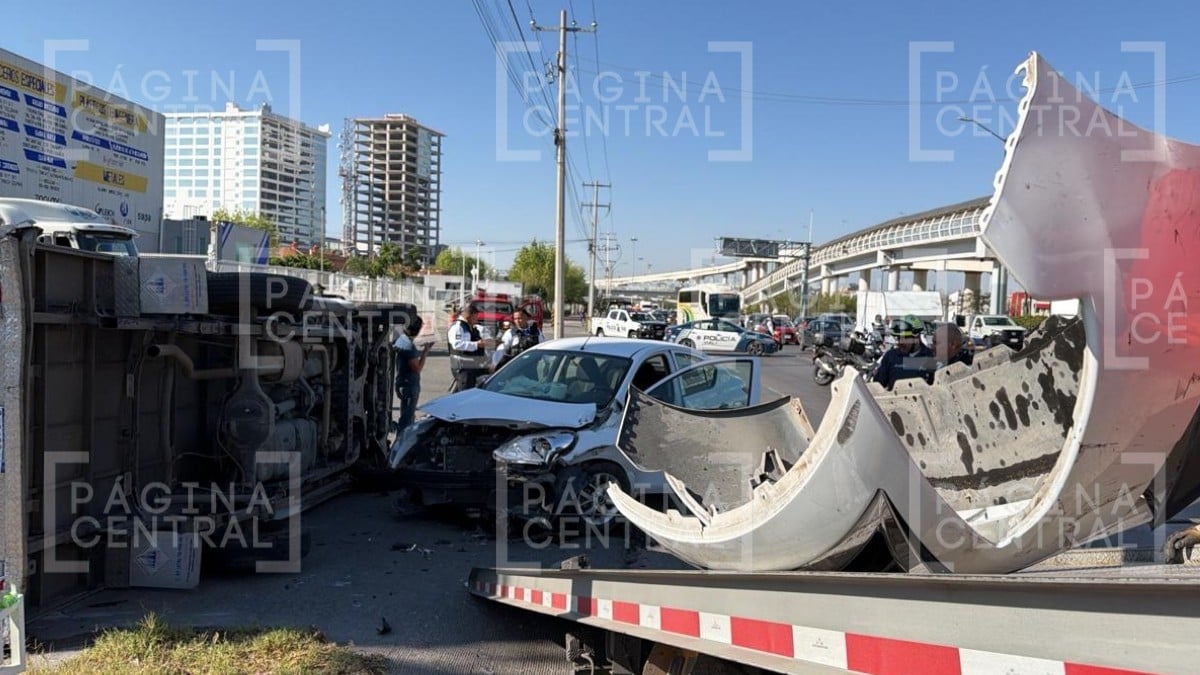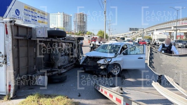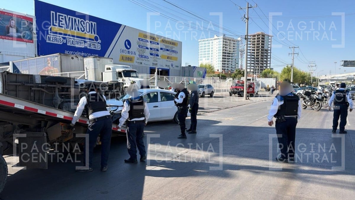 León, Guanajuato - Un fuerte choque terminó en una volcadura en el libramiento; los involucrados fueron una camioneta de carga y un sedán, la mañana de este jueves.