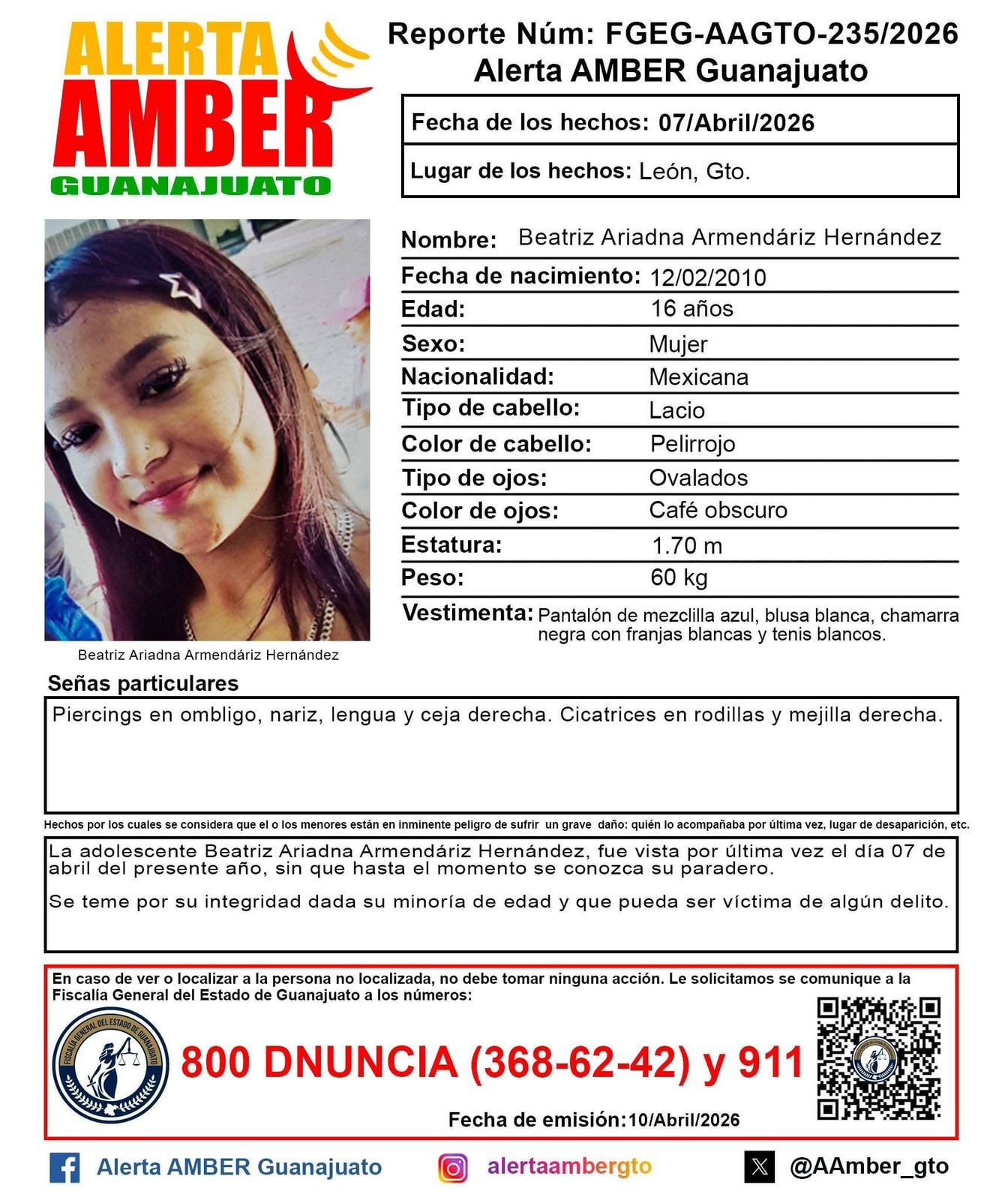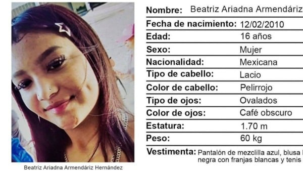 "La adolescente Beatriz Ariadna Armendáriz Hernández fue vista por última vez el día 07 de abril del presente año, sin que hasta el momento se conozca su paradero. Se teme por su integridad dada su minoría de edad y que pueda ser víctima de algún delito".