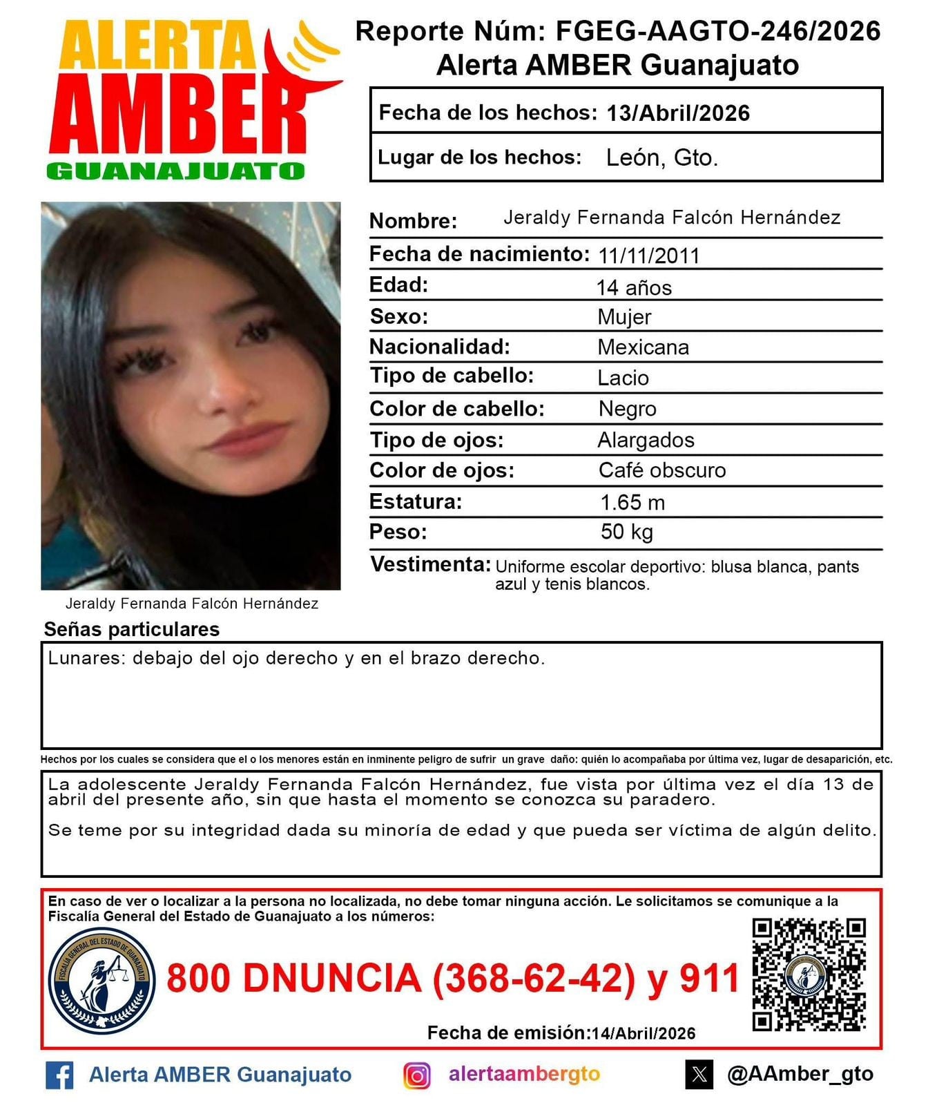 León, Guanajuato - La Fiscalía General del Estado de Guanajuato activó una Alerta Amber para localizar a Jeraldy Fernanda Falcón Hernández, adolescente de 14 años desaparecida en León.