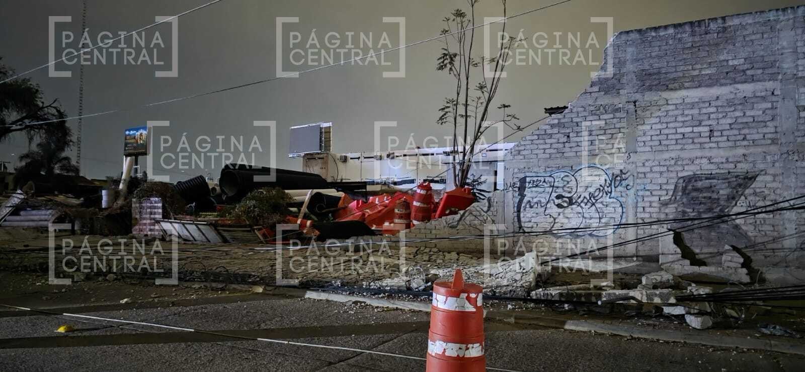 León, Guanajuato - Un aparatoso derrumbe se registró la tarde de este martes donde la barda perimetral de una bodega de materiales colapsó por completo, derribando un poste y ocasionando un apagón en Atotonilco.